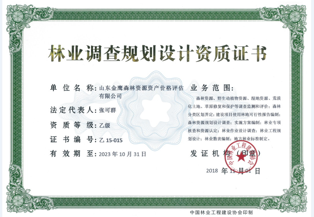 公司現(xiàn)擁有國內(nèi)林業(yè)工程建設(shè)協(xié)會頒發(fā)的《林業(yè)調(diào)查規(guī)劃設(shè)計資質(zhì)證書》乙級資質(zhì)和山東省價格協(xié)會頒發(fā)的《價格評估機構(gòu)登記資格證書》,是省內(nèi)林業(yè)規(guī)劃設(shè)計和森林資源資產(chǎn)評估領(lǐng)域知名的咨詢服務(wù)機構(gòu)。